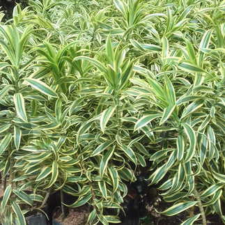 As folhas são simples, coriáceas, ligeiramente onduladas, de cor verde-oliva escuro, dispostas em espiral ao longo do ramos. Ocorrem ainda outras variedades, com destaque para duas cultivares variegadas: a “Song of India”, com folhas de margens cor verde-limão, e a “Song of Jamaica”, de margens cor branco-creme. As flores pequenas e brancas surgem no final do inverno reunidas em inflorescências terminais e, assim como os frutos, não têm importância ornamental.